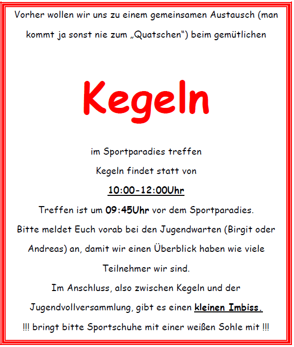 Also: Zieht Euch warme Sachen an, es ist eine Eisbahn. Bitte auch an Getränke und einen kleinen Imbiss für Euch denken. Es gilt „Selbstverpflegung“.
